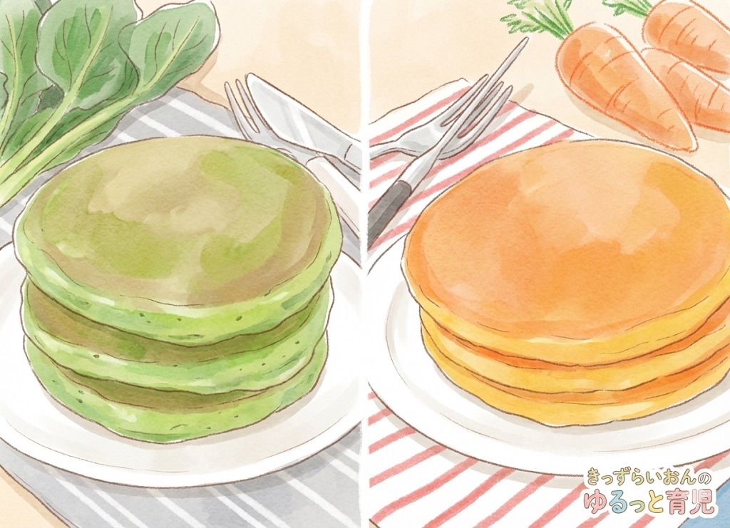見た目は緑色ですが、「これは怪獣さんのパワーが出るパンケーキだよ!」(嘘ではない…かも?)」と楽しく伝えれば、意外と食べてくれます。