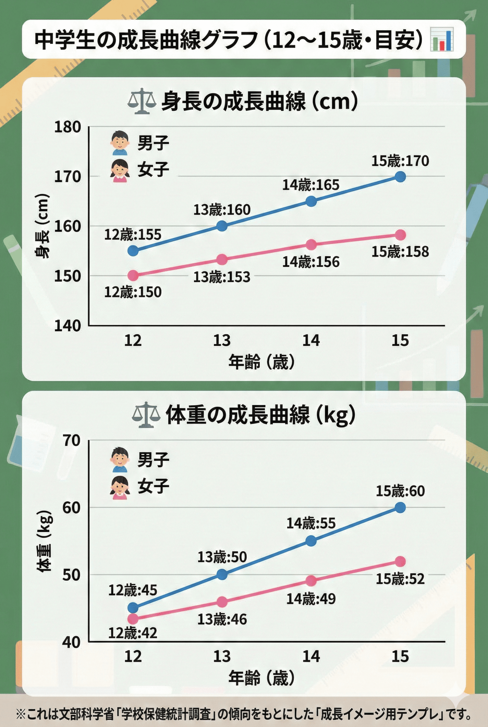 以下は、中学生(12〜15歳)の身長・体重の成長の目安です。
